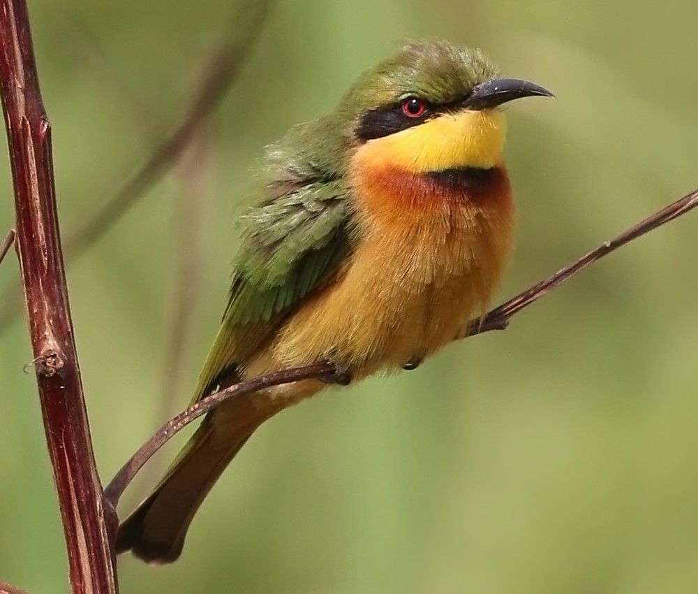Little Bee-eater: As its name suggests, the Little Bee-eater feeds primarily on bees and other flying insects. It is a small bird with bright green plumage, a black mask around its eyes, and a thin, curved beak.